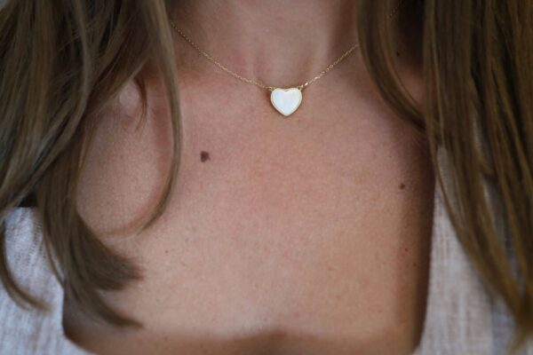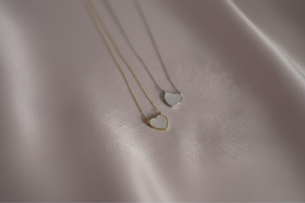 Ogrlica “Mother of pearl srce” izrađena je od srebra 925 i prirodnog sedefa. Dužina ogrlice je 40 cm, uz produžetak od 3 cm.
